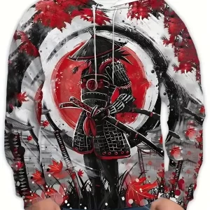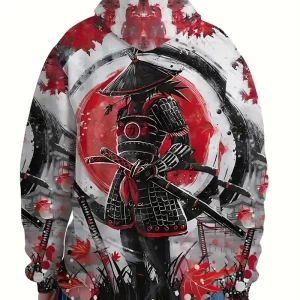 Men's Casual 3D Samurai Print Polyester Knit Hoodie Slight Stretch Front Pocket Regular Fit Trendy Leisure Activewear Sweatshirt