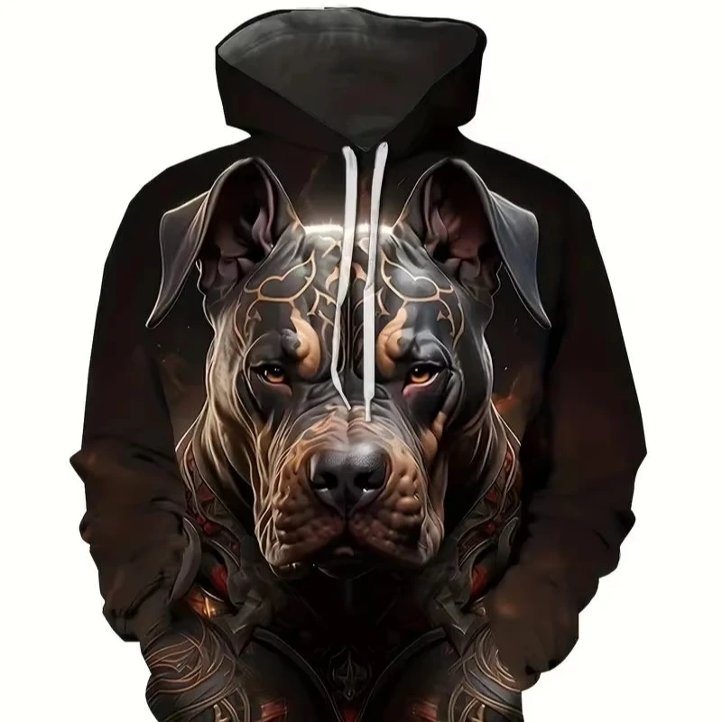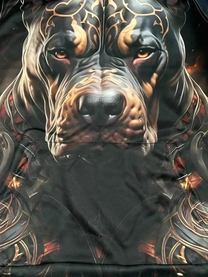 Men’s Casual Comfortable Plus Size Pullover Fleece Hoodie Autumn 3D Dog Print Crocheted Oversized Fit Hooded Collar Pocket