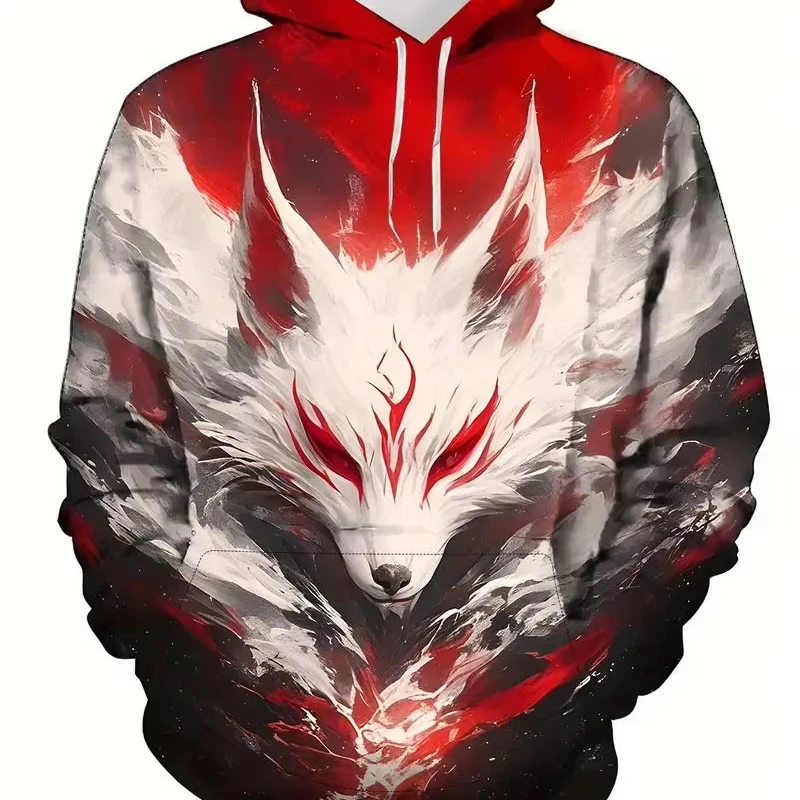 Men’s Casual Fall/Winter Streetwear Outerwear Geometric Ink Style Fox Print Hoodie Long Sleeves Regular Fit Digital Print