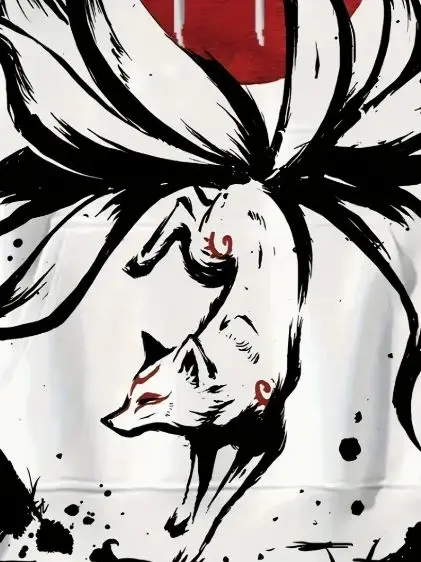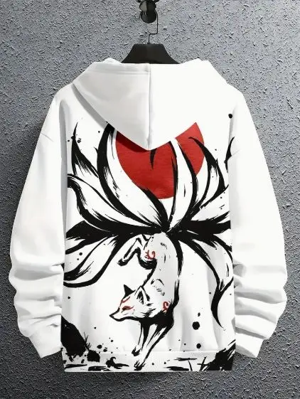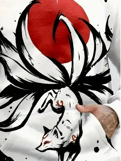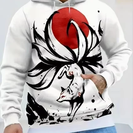 Men’s Casual Party Wear 3D Digital Printed Nine-Tailed Fox Hoodie Polyester Geometric Pattern Sweatshirt Kangaroo Pocket