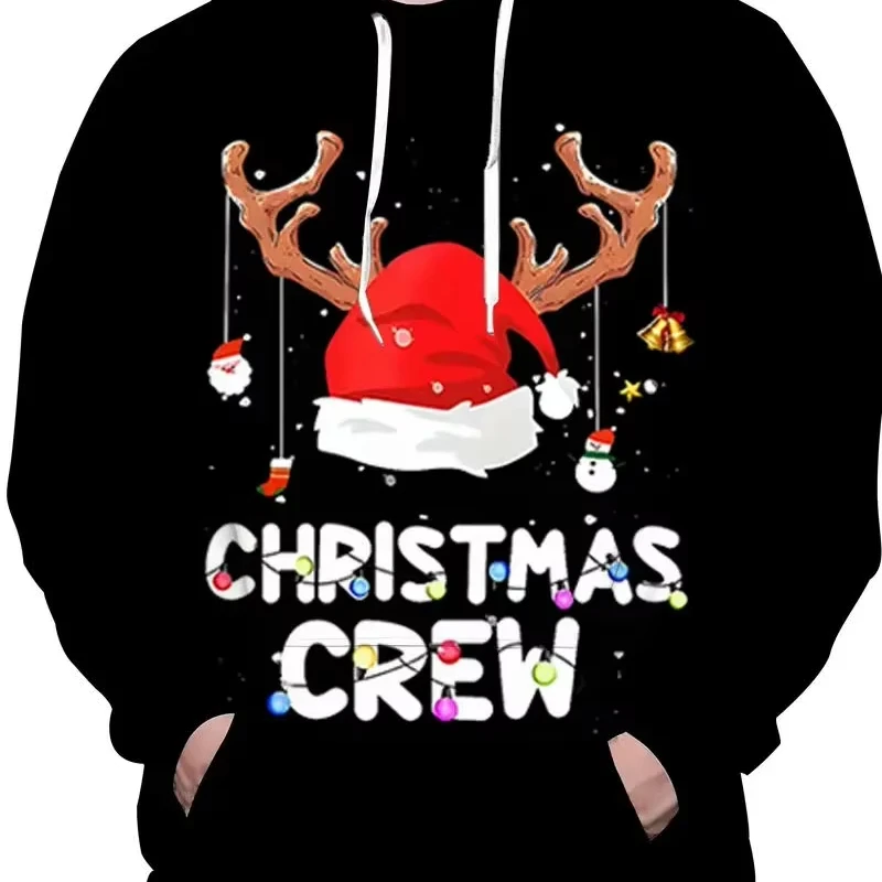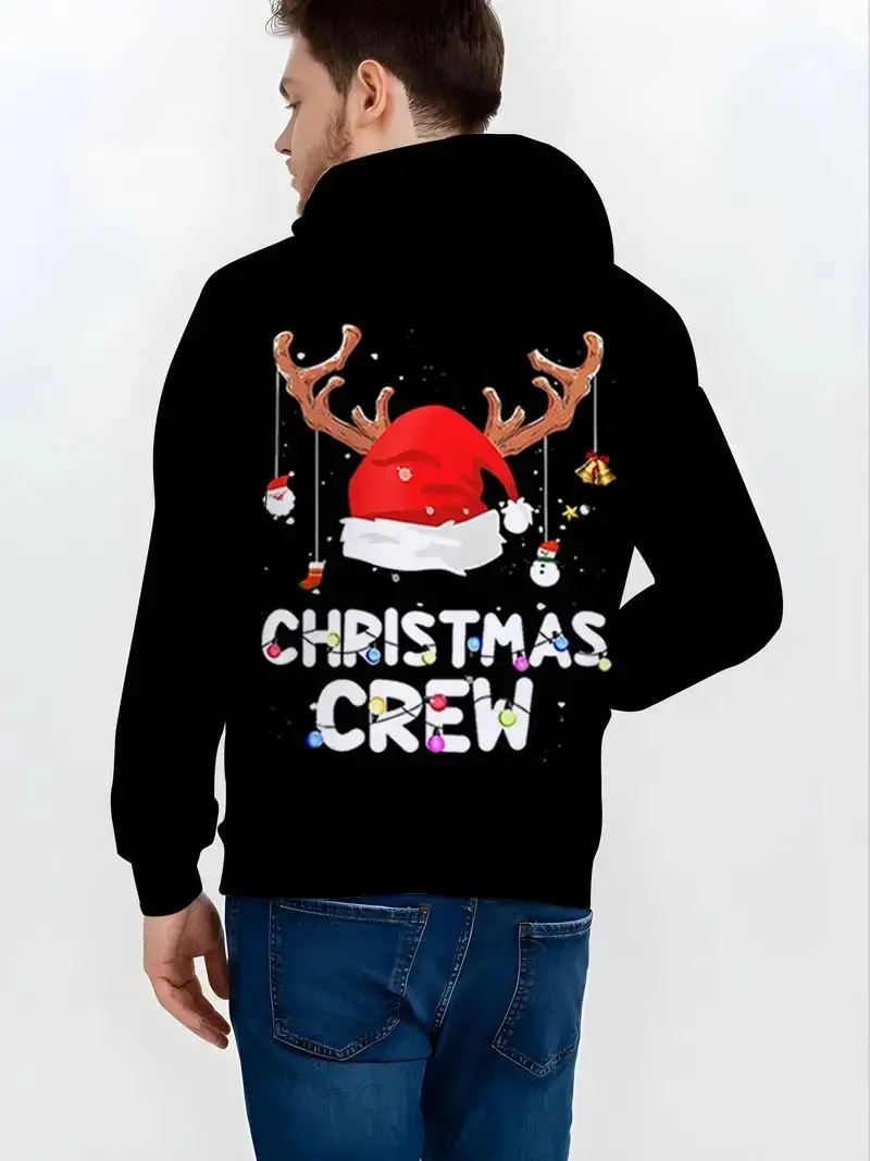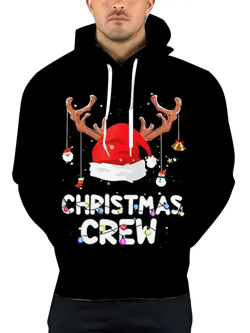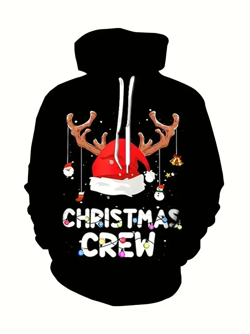 Men’s Casual Polyester Stretch Knit Sweatshirt 3D Reindeer Santa Hat Design Crewneck Hoodie Puff Regular Fit Novelty Christmas