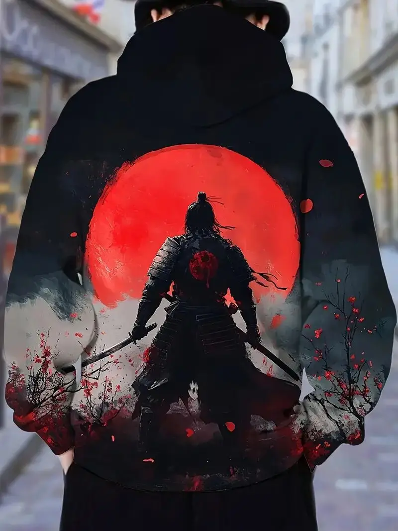 Men’s Casual Pullover Hoodie with Samurai Red Moon Cherry Blossom 3D Print Kangaroo Pocket Machine Washable Fleece Supply
