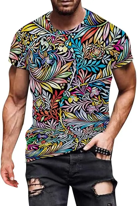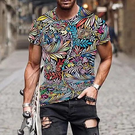 Men’s Summer Fashion Casual 3D Digital Print T-Shirt V-Neck Short Sleeve Knitted Fabric Sizes Medium Crew Neck