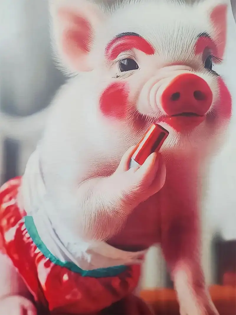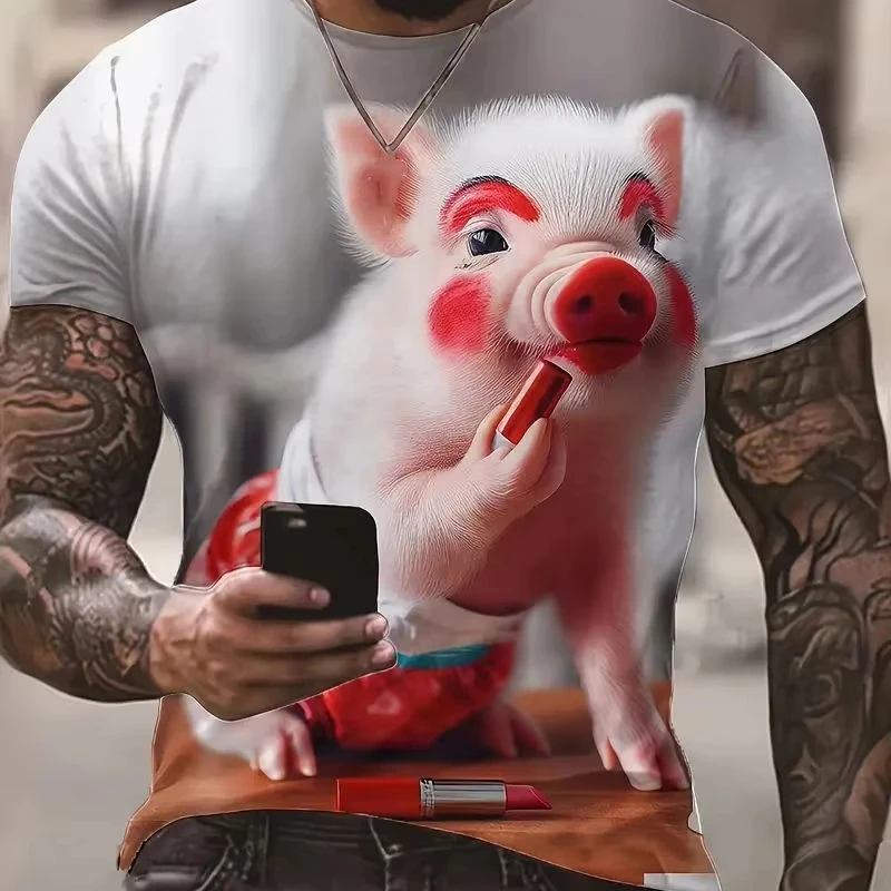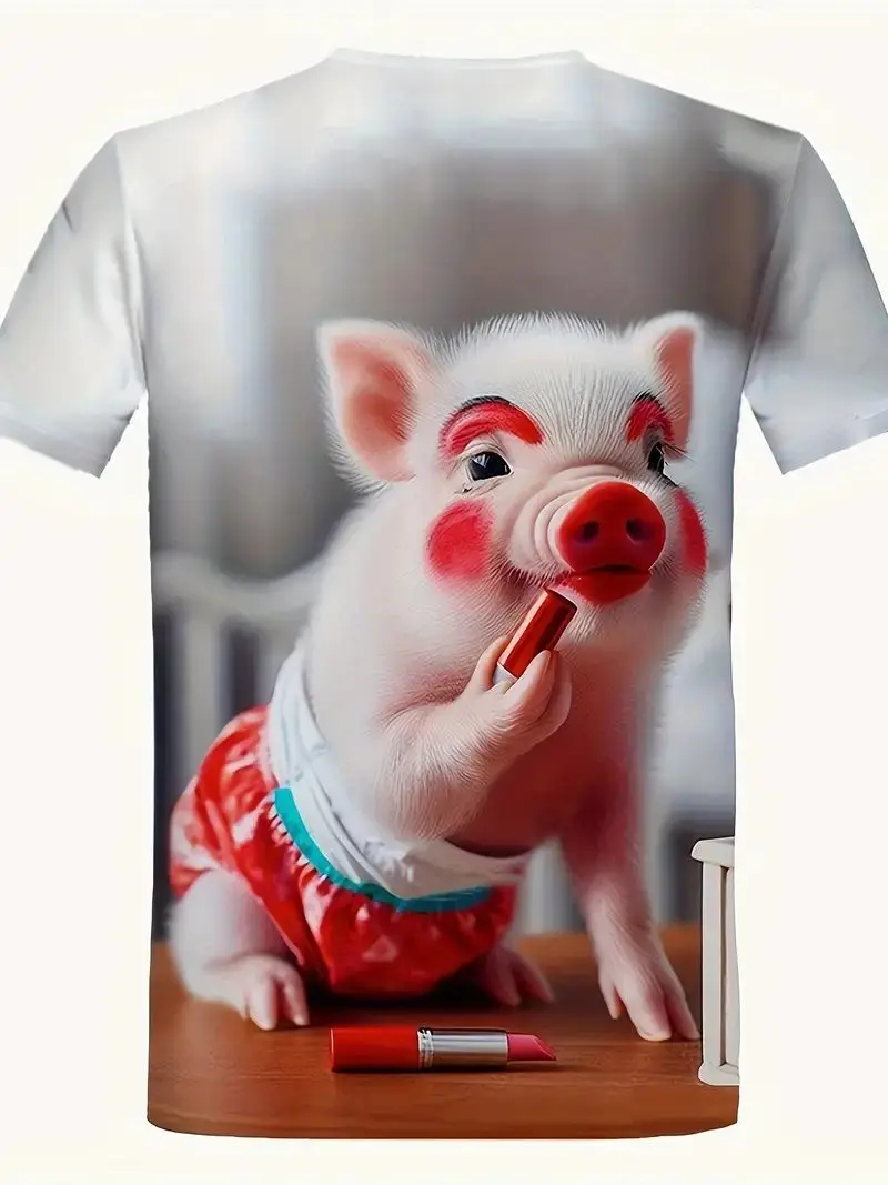 Men’s funny pig 3D Digital Animal Doing Makeup T-Shirt Crew Neck Short Sleeve Knitted Top for Summer Leisurewear